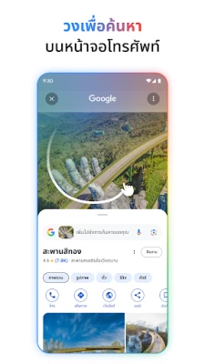 ปลดล็อกมิติใหม่แห่งการค้นพบด้วย Google ผู้ช่วยอัจฉริยะที่ช่วยให้คุณเข้าถึงข้อมูลได้อย่างไร้รอยต่อ เพียงแค่คุณเห็นสิ่งใดบนหน้าจอ ไม่ว่าจะเป็นรูปภาพ วิดีโอ หรือข้อความ คุณก็สามารถ "วง" "ไฮไลต์" หรือ "แตะ" เพื่อเริ่มต้นการค้นหาได้ทันที ไม่จำเป็นต้องสลับแอปไปมาอีกต่อไป สัมผัสความมหัศจรรย์ของการค้นหาด้วยภาพบนสมาร์ทโฟน Android ระดับพรีเมียมบางรุ่น พร้อมใช้งานในบางภาษาและสถานที่ เพื่อตอบทุกความอยากรู้อยากเห็นของคุณในพริบตา